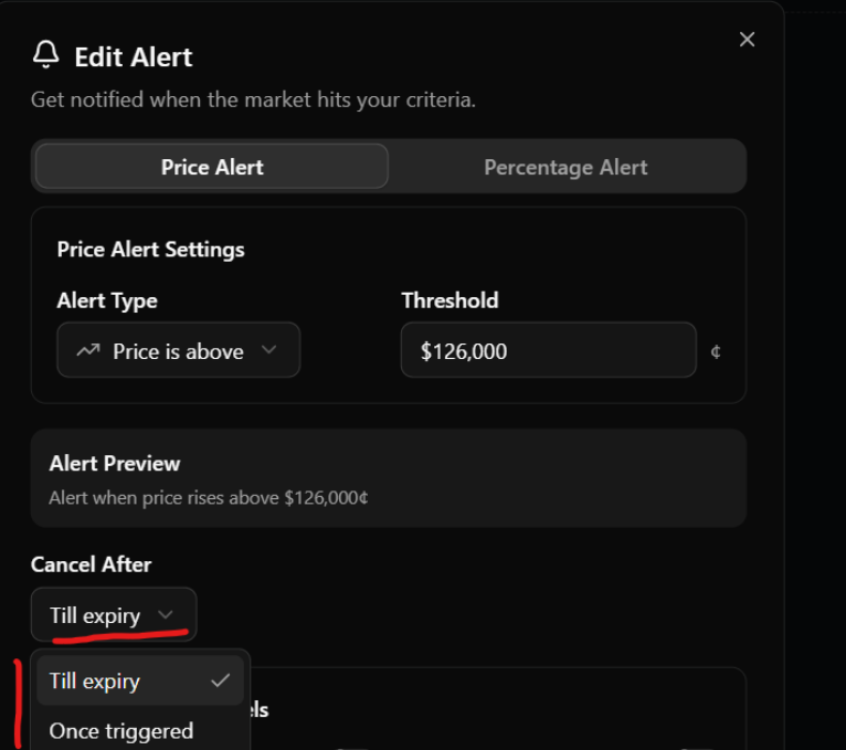 This step helps you control how long your alert stays active. On MarkiumPro, you’ll notice two options under “Cancel After” – Till Expiry and Once Triggered.