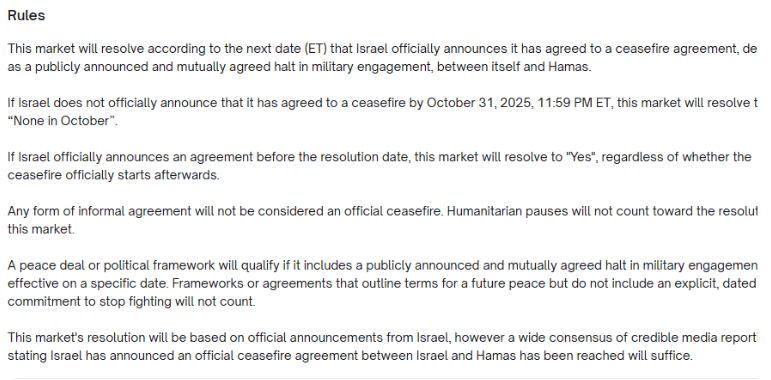Polymarket "When will Israel announce ceasefire?" Rules show the kind of language that trips traders up, it requires an official, mutually agreed halt in military engagement, excludes humanitarian pauses, and accepts a wide consensus of credible media as sufficient in some situations.